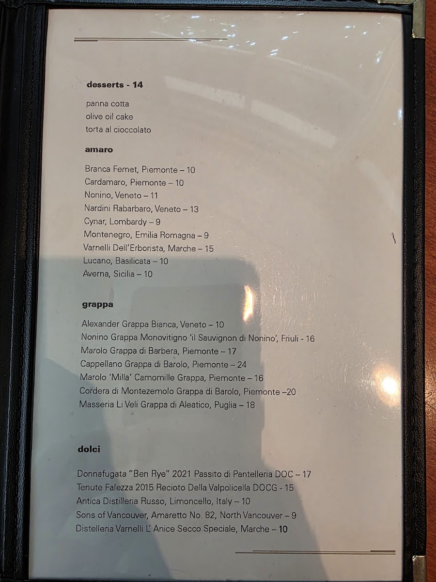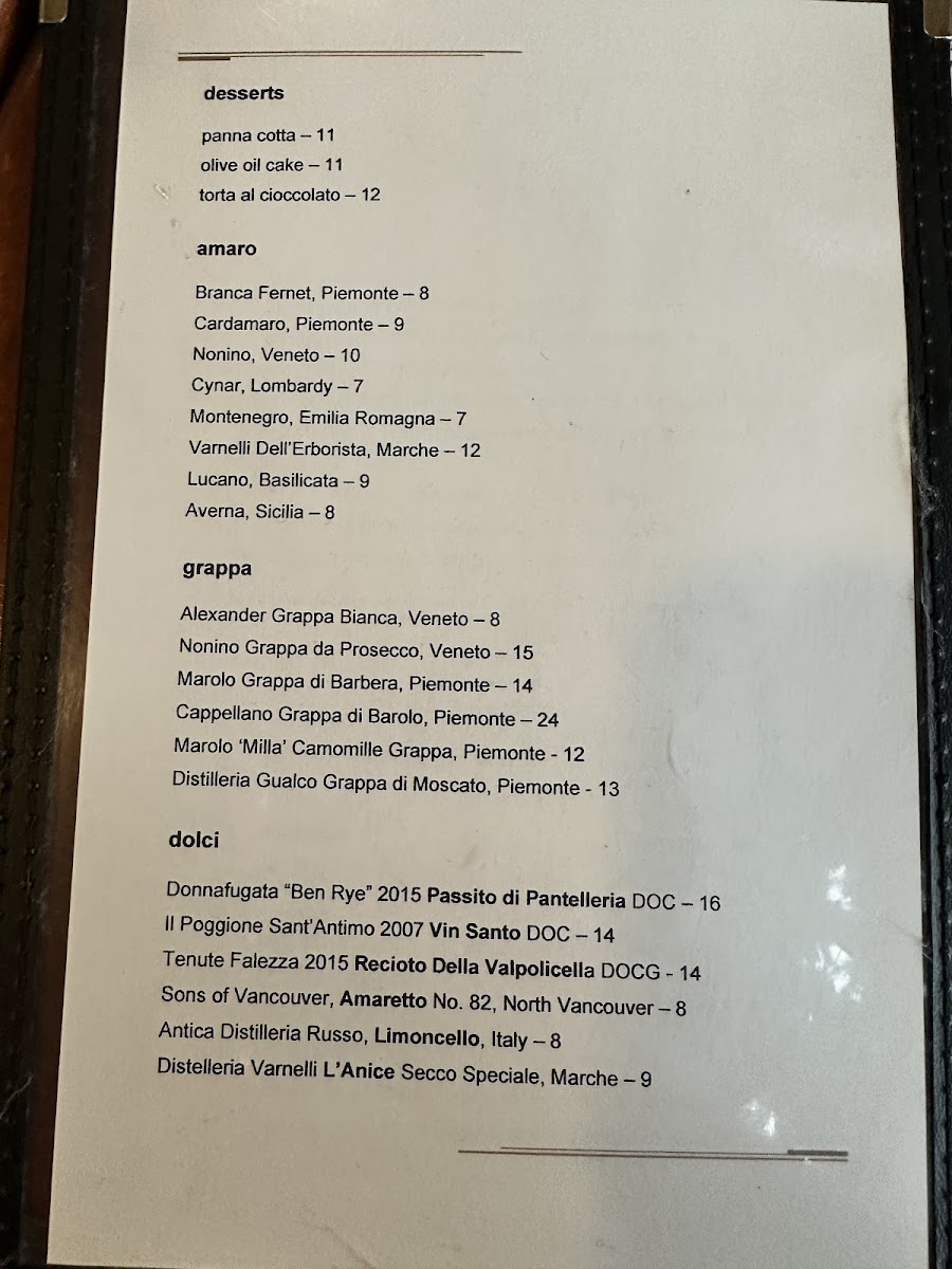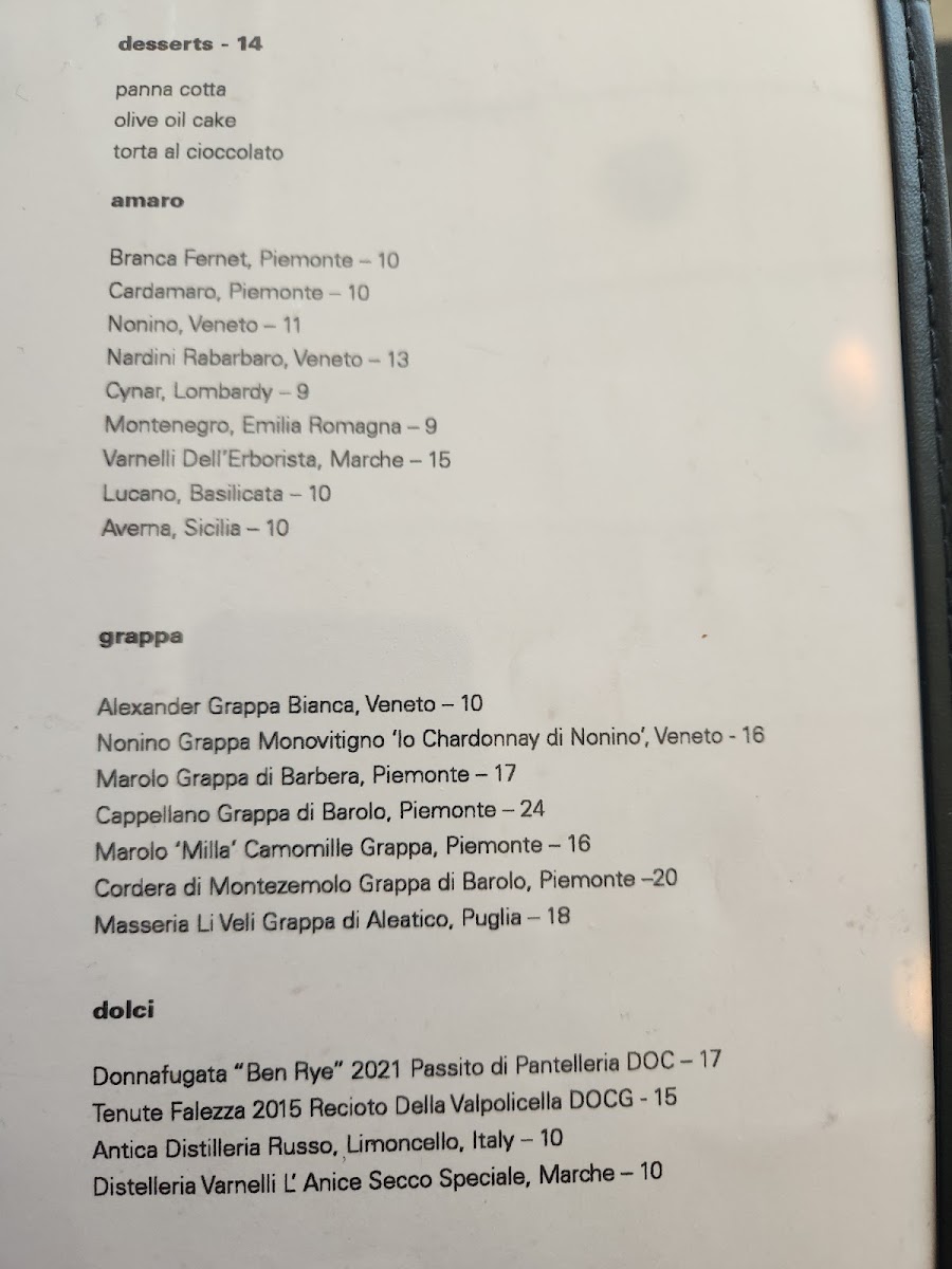 The selection includes a variety of housemade pastas such as tagliolini carbonara with a poached egg, pappardelle alla bolognese, and vibrant options like campanelle with pesto verde and mint ricotta. Light starters and sides like arugula and fennel salad or pork belly complement the pasta offerings, while desserts such as panna cotta and olive oil cake offer a gentle, satisfying finish to the meal.