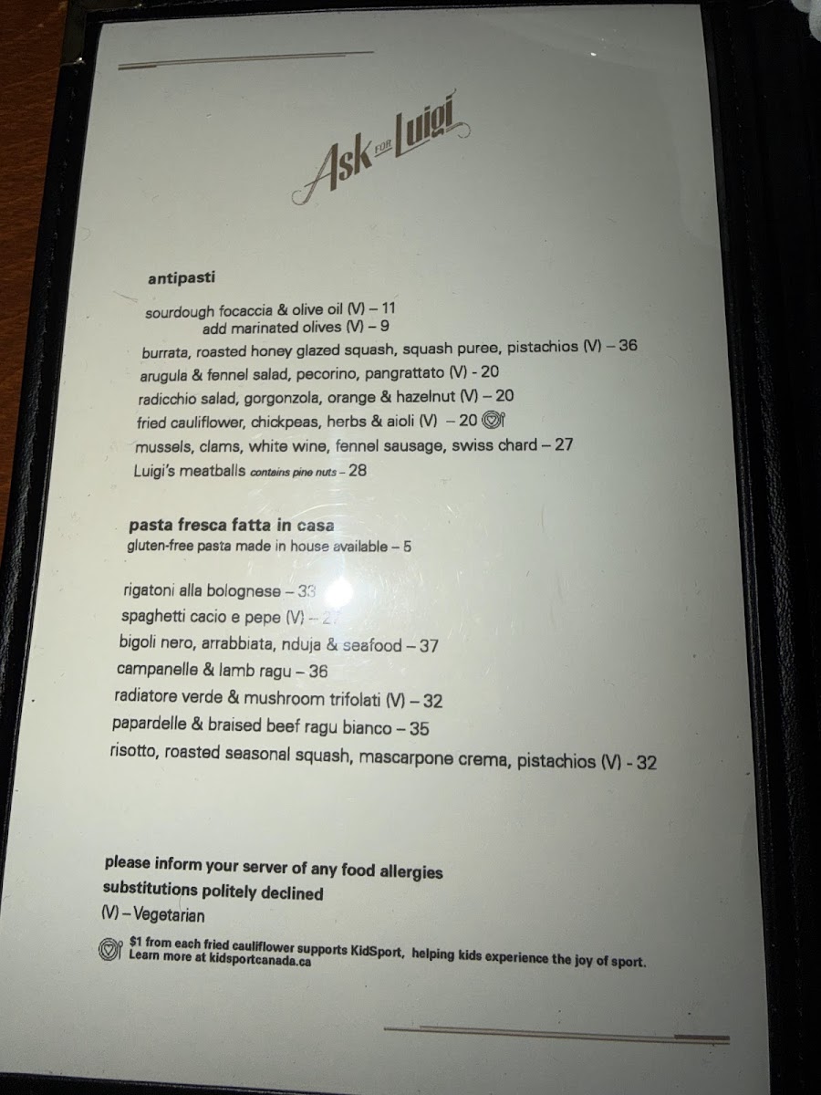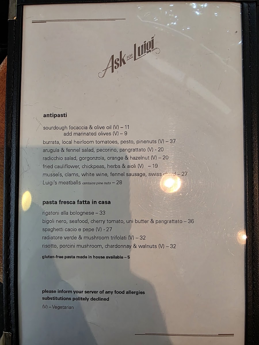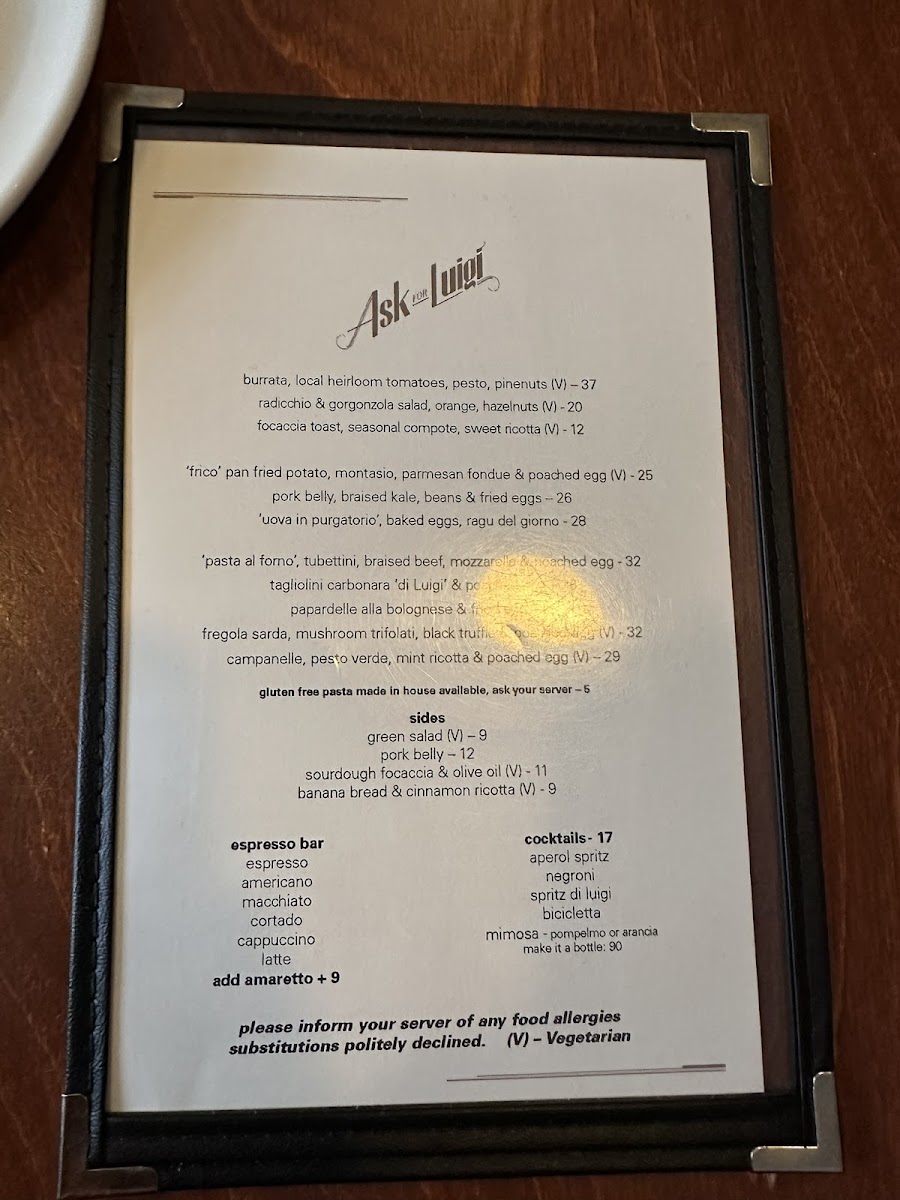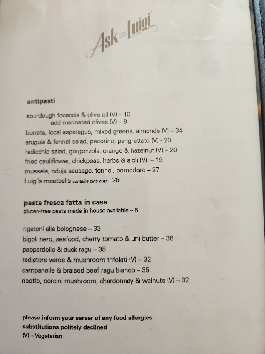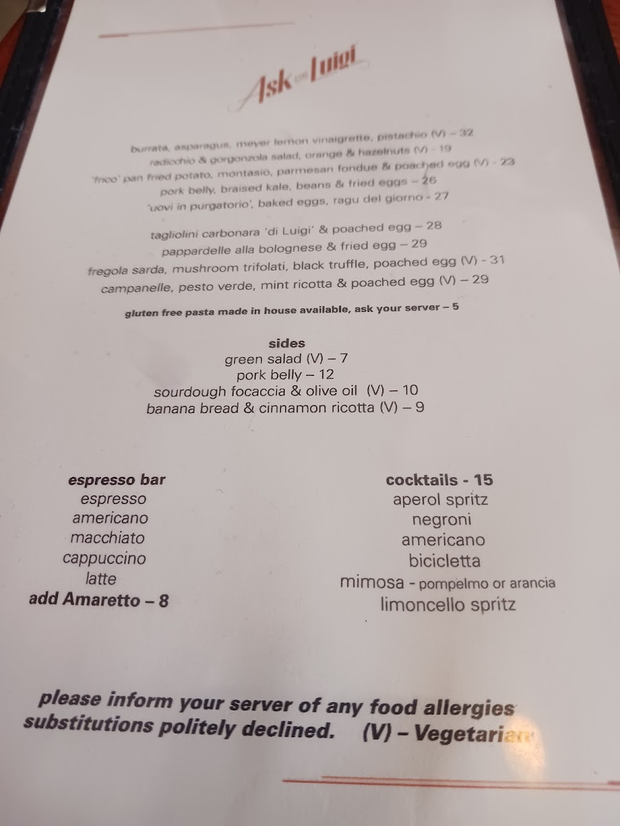 Ask For Luigi offers a thoughtfully curated menu centered around authentic Italian flavors presented in a cozy, intimate setting. The dishes often feature freshly made pasta and seasonal ingredients, creating a sense of comfort without formality. Perfect for a relaxed lunch or a laid-back evening meal, the menu invites diners to savor familiar classics alongside inventive seasonal plates.